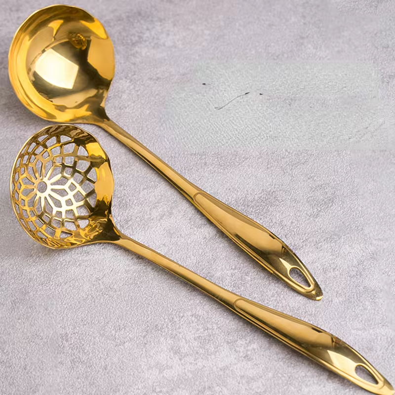 Crafted from durable stainless steel, the Hollyn Soup Ladle is a versatile addition to your kitchen. With a large golden bowl and slotted design, it efficiently serves and strains soups and stews. Perfect for hot stews, this ladle is a must-have for any home chef.