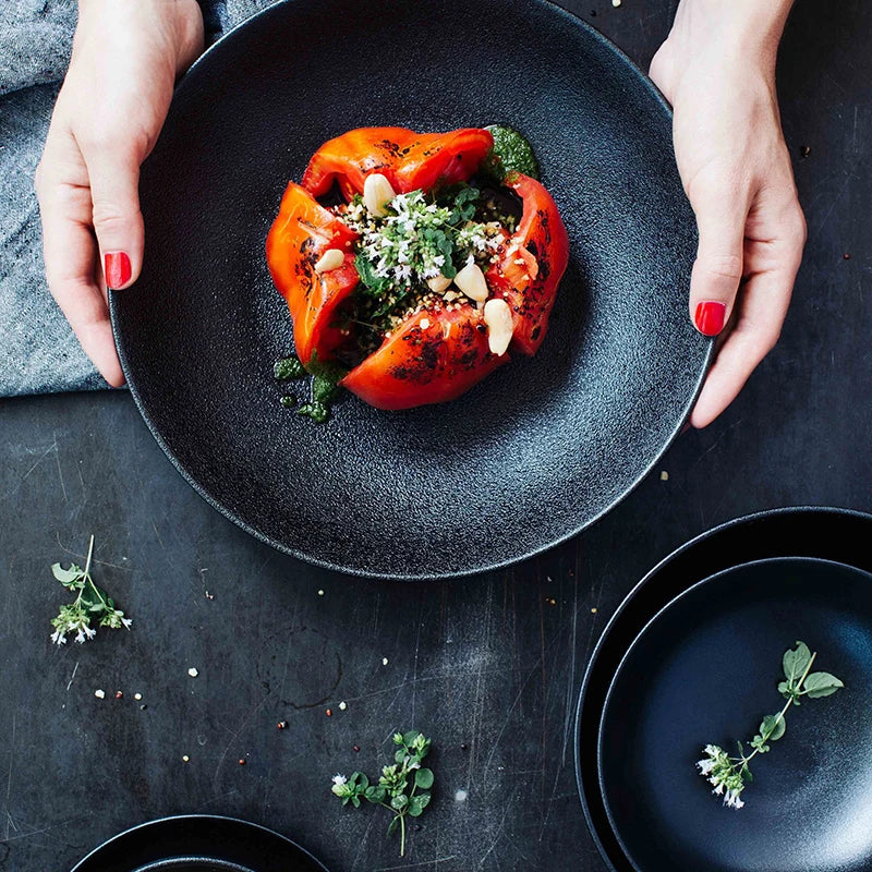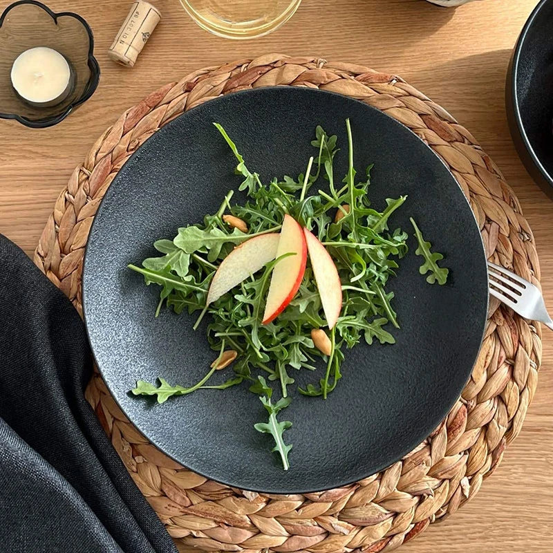 Crafted with high-quality black glazed porcelain, the Josiah Black Dinner Plates are a must-have for any dining room. This round tray set features a sleek design that adds a touch of elegance to any table setting. Elevate your dining experience with these durable and stylish plates.