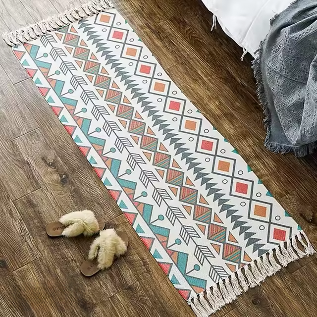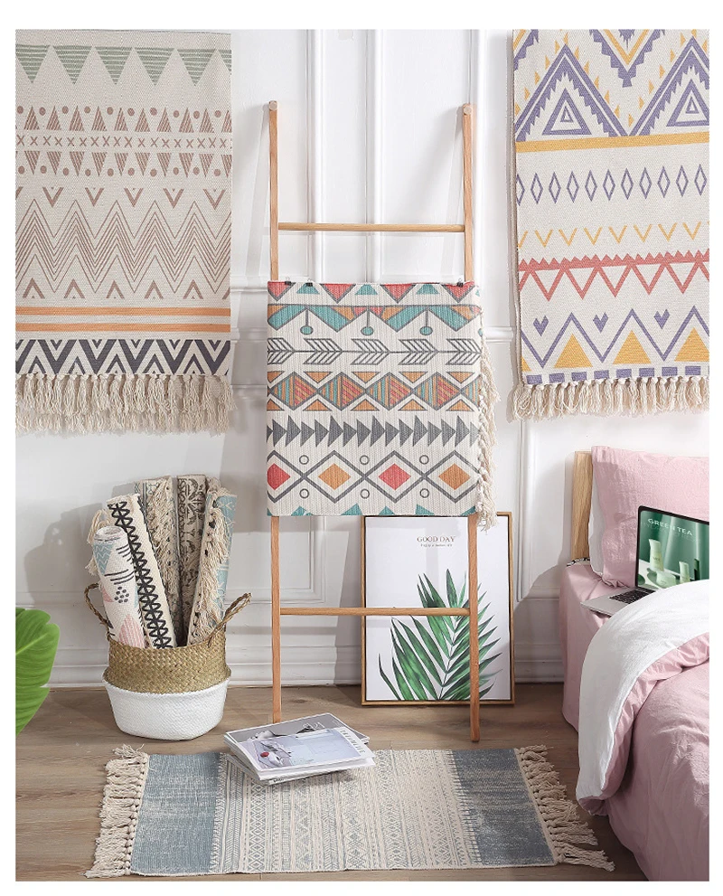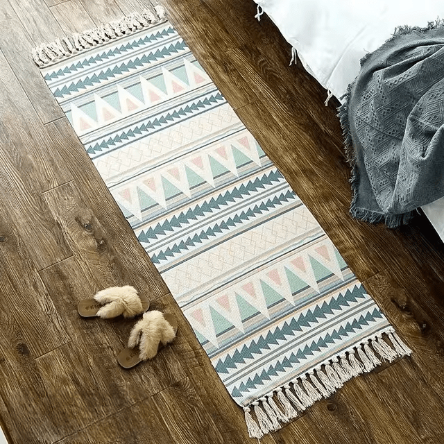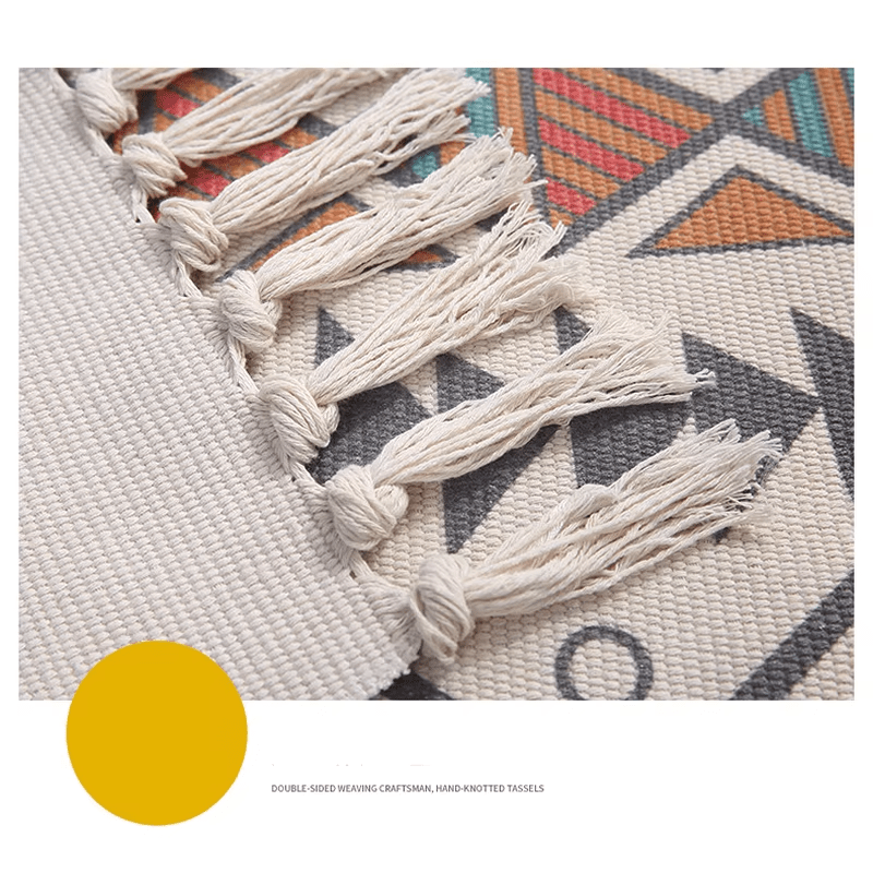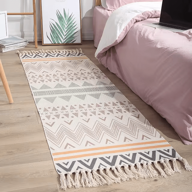 The Ruta Hand Knotted Area Rug combines luxury and bohemian style in this ethnic-inspired carpet. Made from cotton and linen, this soft and handmade tassel rug adds a touch of elegance to any living room or bedroom. Perfect for adding a cozy and Bohemian vibe to your home décor.