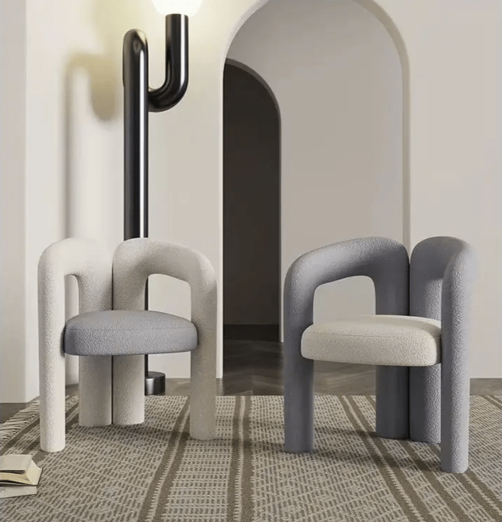Introducing the Camdyn Bouclé Dining Chair, the perfect addition to any modern minimalist space. This gray & white colored chairs feature an elegant design and are made with bouclé fabric, providing a comfortable and stylish seating option. Perfect for adding a touch of luxury to your dining room, bedroom, or makeup area.