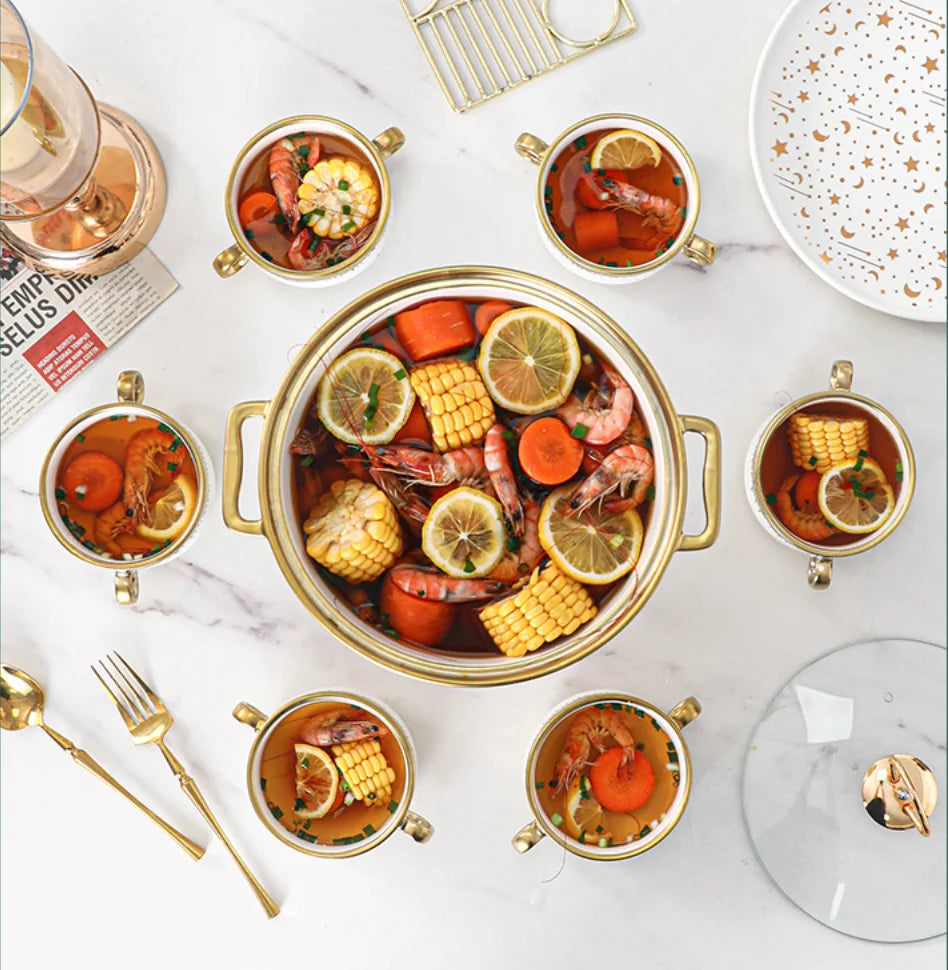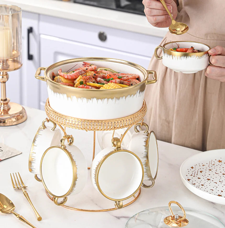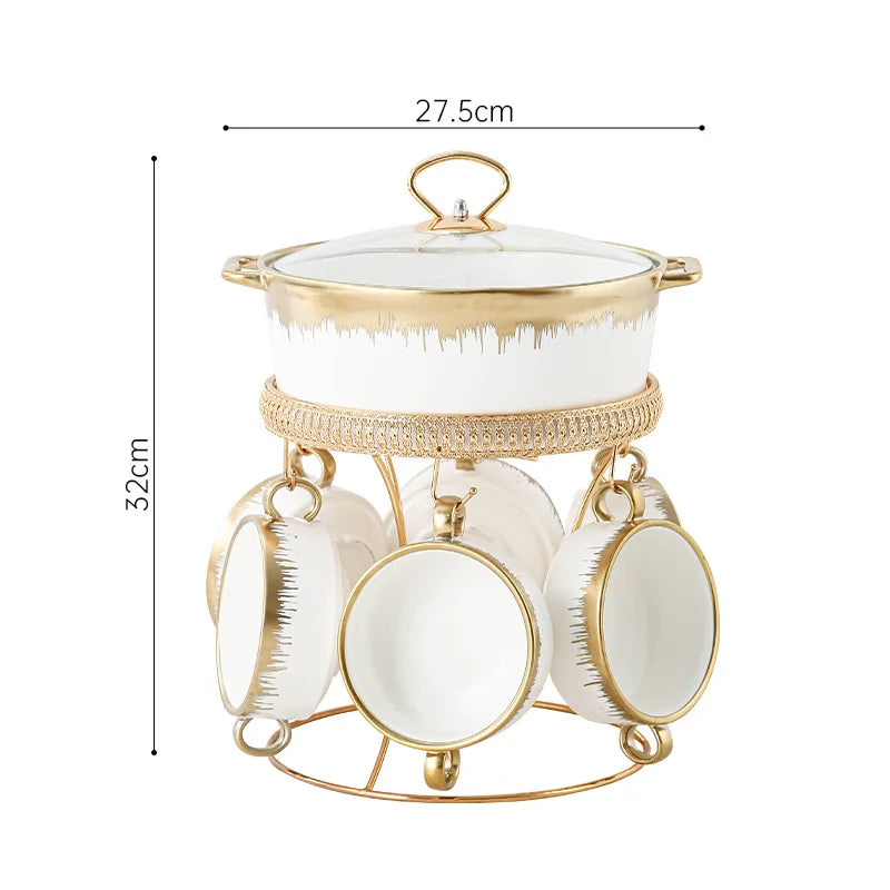 Expertly crafted and designed, our Ceramic Soup Pot Set is a must-have for any home cook. Made with high-quality ceramic, this set includes a variety of pot sizes and a convenient wrought iron storage rack. Its modern and sleek design adds a touch of elegance to your kitchen, while its durable construction ensures long-lasting use. Elevate your culinary experience with this light and luxurious soup pot set.