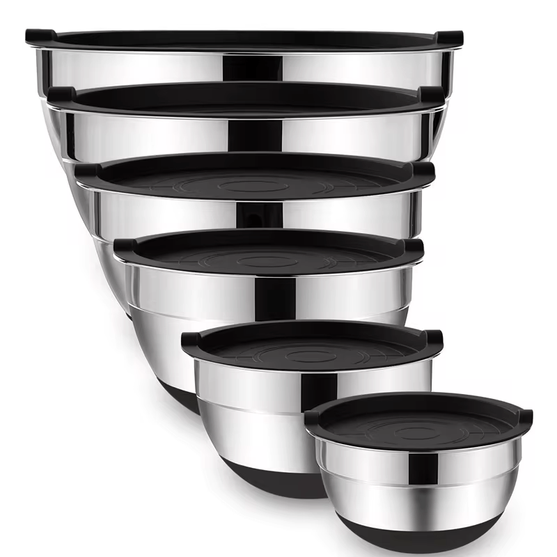 Expertly designed Chidi Mixing Bowls with Lids are a must-have for any baking enthusiast. Crafted from durable stainless steel, these nesting bowls come with non-slip bases for stable mixing. The airtight lids provide convenient storage and keep your ingredients fresher for longer. Elevate your baking game with this kitchen bowls with covers.