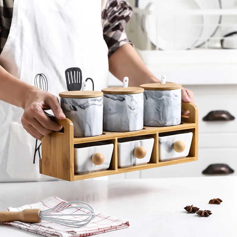 Expertly organize spices with the Dreyfus Spice Jars Set. This 6-piece set features double layer marble jars that are both functional and stylish. The bamboo lids provide an airtight seal to keep spices fresh. Elevate your kitchen experience with this spice canisters.