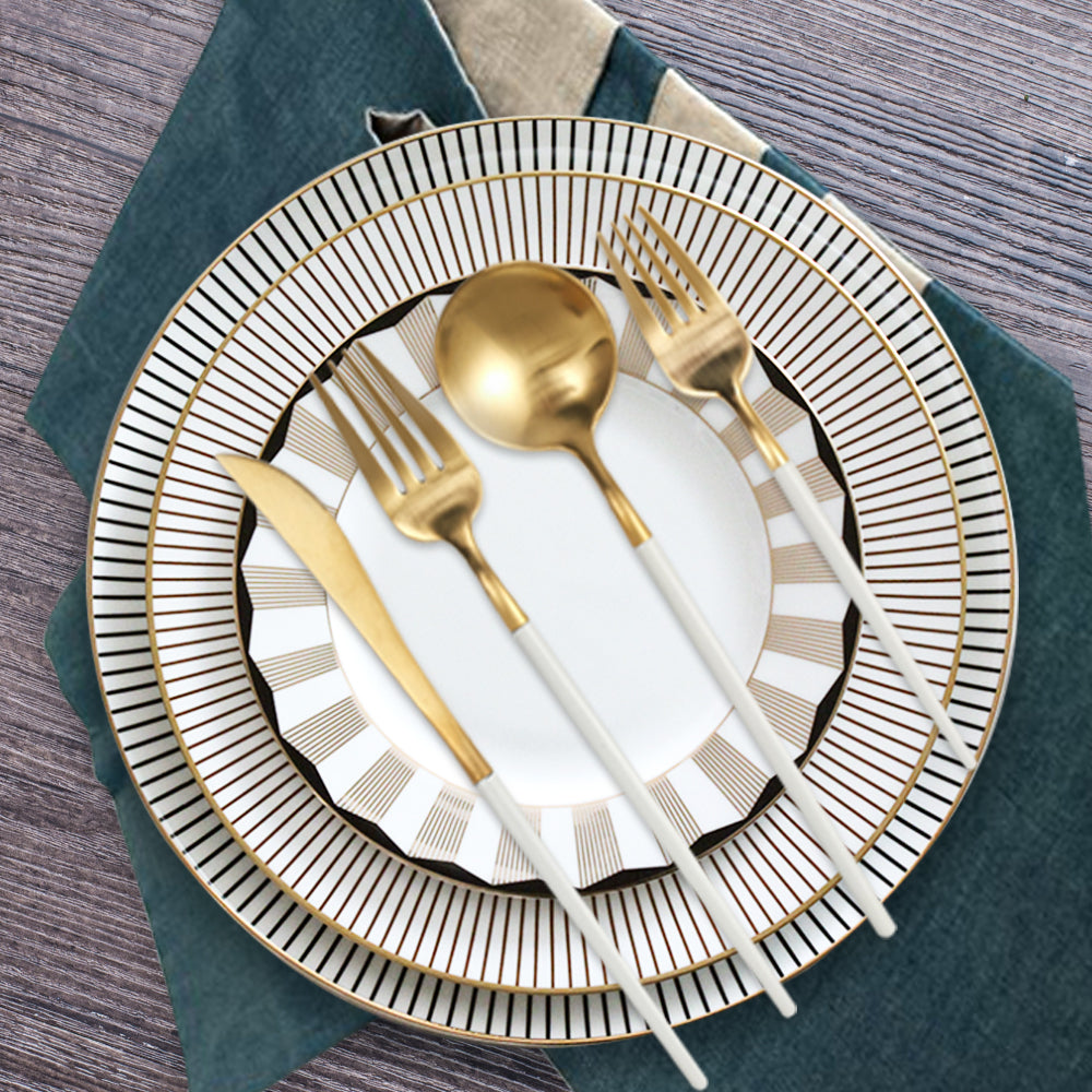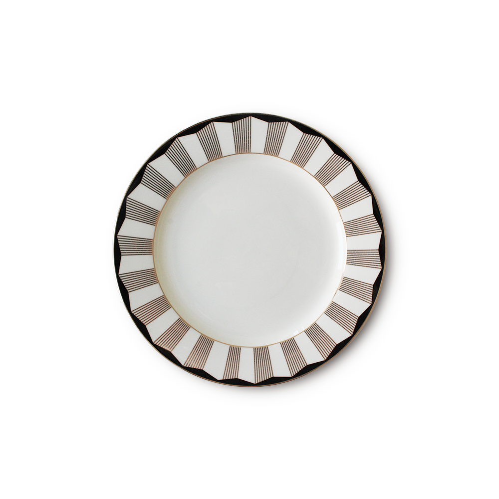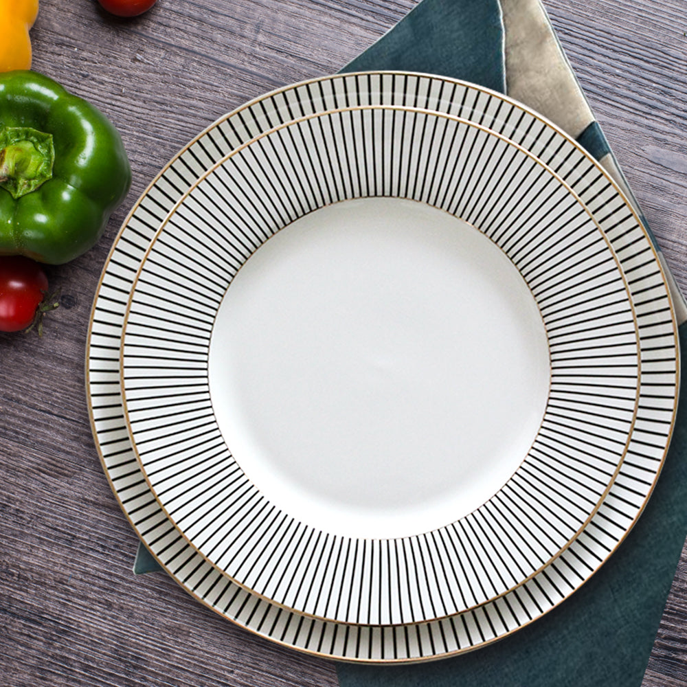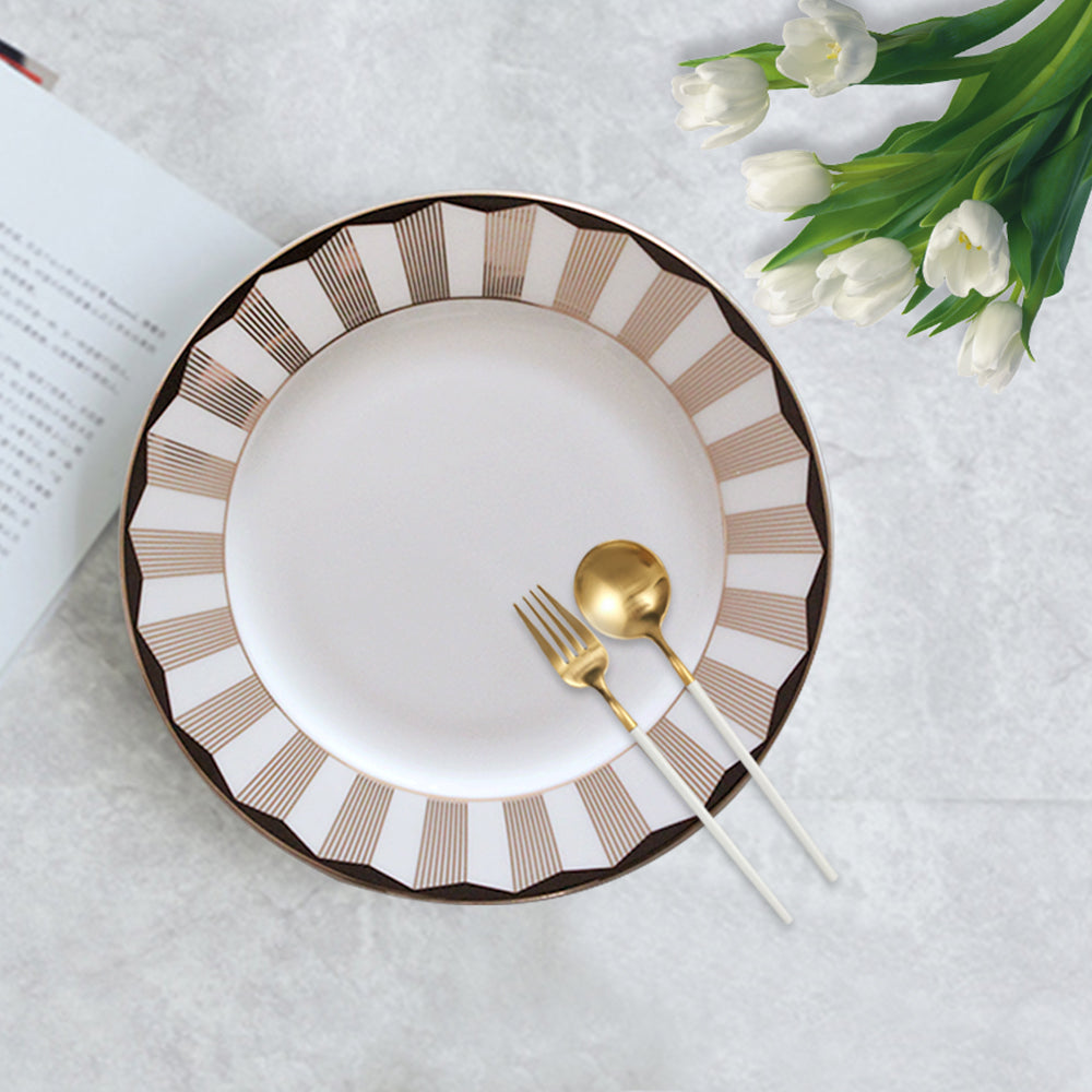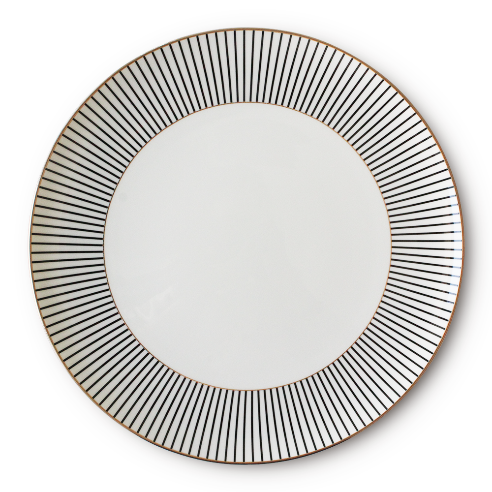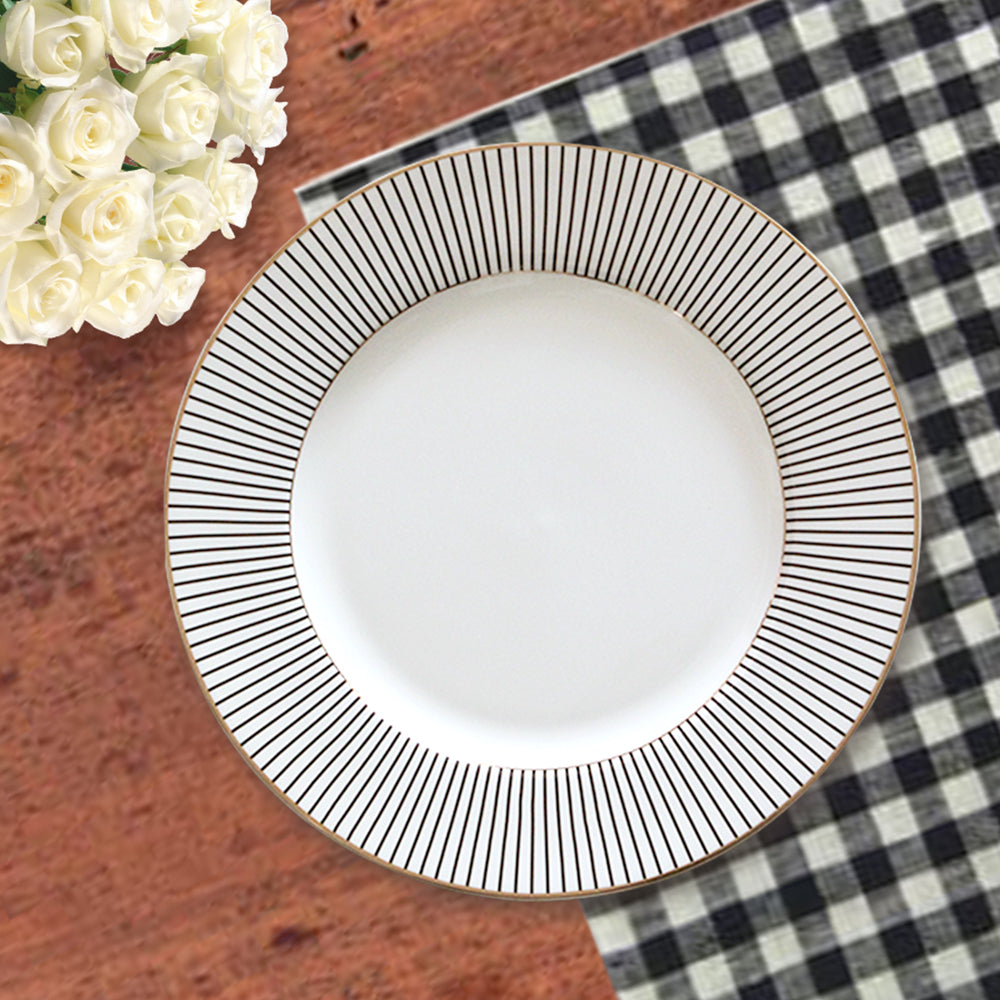 The Emilia Dinnerware Collection features elegant gold and black rimmed plates, perfect for any dining occasion. Elevate your dining experience with this elegant dinnerware set.