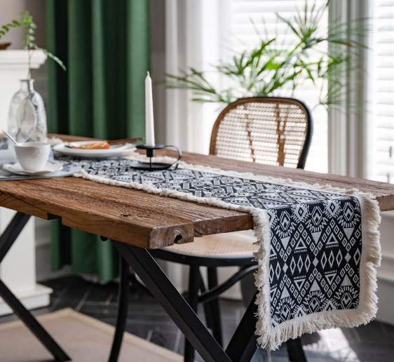 Introduce elegance to your table with the Nash Jacquard Table Runner. Its black and white geometric design and tassel detail add a touch of sophistication to any occasion. Not only does it serve as a tablecloth, but it can also be used as a TV cabinet dust cover or as a decorative accent for your home.